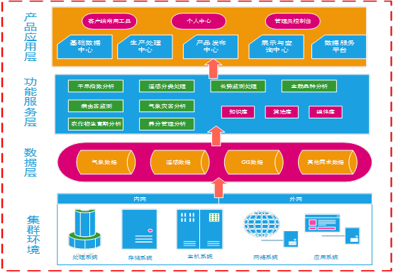 本系统的数据主要包含气象数据、遥感数据、GIS数据、农业基础数据。其中数据包含多源遥感卫星影像、全国气象数据、全国营养指标、全国土地类型、 全国多作物生育期等相关数据,为功能服务层提供数据支撑。