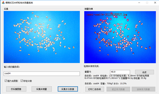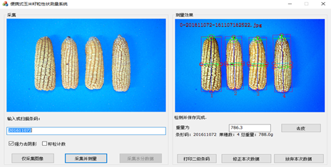 便携式玉米果穗考种系统在果穗测量状态下,可同时分析多个玉米果穗图像,单次测量时间小于3秒。可自动测量玉米穗长、 穗粗、秃尖、穗行数、行粒数、穗周长、穗截面积、穗体积、粒宽、粒厚等十多个指标。良好光照条件下精度在95%以上, 可半自动分析粒型、粒色、轴色和穗型等参数。系统在籽粒测量(脱粒)状态下,可自动识别玉米籽粒数量、百粒重,正确率可达100%,籽粒粒长、粒宽,准确率95%以上。