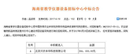 1、北京兴农丰华科技有限公司获得了中国热带农业科学院热带作物品种资源研究所的农业部植物新品种测试儋州分中心建设项目中DUS田间测试平台建设;