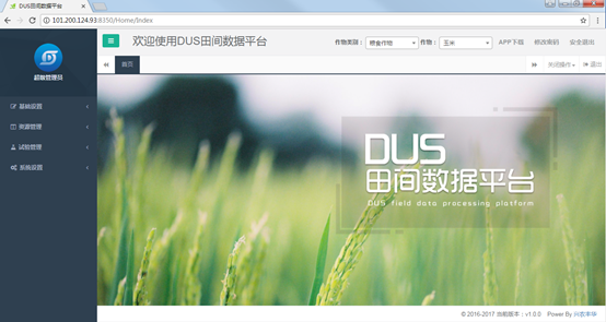 DUS田间数据平台是北京兴农丰华科技有限公司自主设计开发的田间数据平台,目前包括系统设置、基础设置、资源管理和试验管理四大模块, 实现对不同机构对DUS试验基础信息、资源信息、试验信息、田间数据和人员权限过程的管理。。